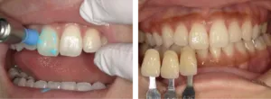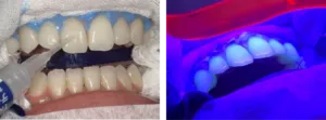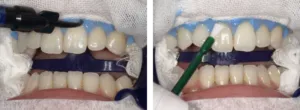 ホワイトニング薬剤を歯の表面に塗布し、光を当てていきます。12分照射を3回行います。