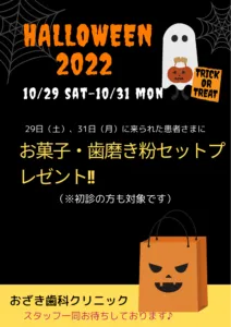 news 2022.10.20 ハロウィンの季節ですね🎃 こんにちは、おざき歯科クリニックです🦷🪥 今月31日(月)はハロウィンですね🎃 10月29日(土)、31日(月)の2日限定ですが、来ていただいた患者さま全員にささやかながらお菓子と歯磨き粉のセットをお渡しします😊✨初診の方もお渡しします✨ 楽しんで歯医者に通って、健口を維持しましょう😊✨ 土曜日は予約が混み合いますので、お早めに🙇♀️ 仮装したしろくまがお待ちしています✨✨ おざき歯科クリニック facebook Line twitter google